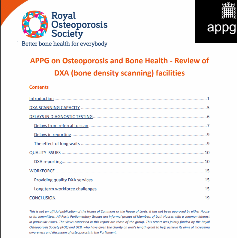 This report from the All-Party Parliamentary Group for Osteoporosis and Bone Health reviewed access to bone density scanning (DXA) for people with osteoporosis.